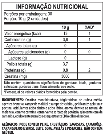 Cada porção (2 gummies) entrega 3g de creatina pura, com absorção eficiente e sabor irresistível de melancia — o único no mercado.